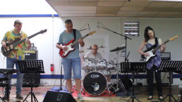 Louis a écrit une chanson avec sa guitare, une ligne de basse. Donc Louis a pris la basse pour cette première performance. Marianne, derrière la batterie, assure la structure. Quasiment debout pour finir le break toutes les 4 mesures!